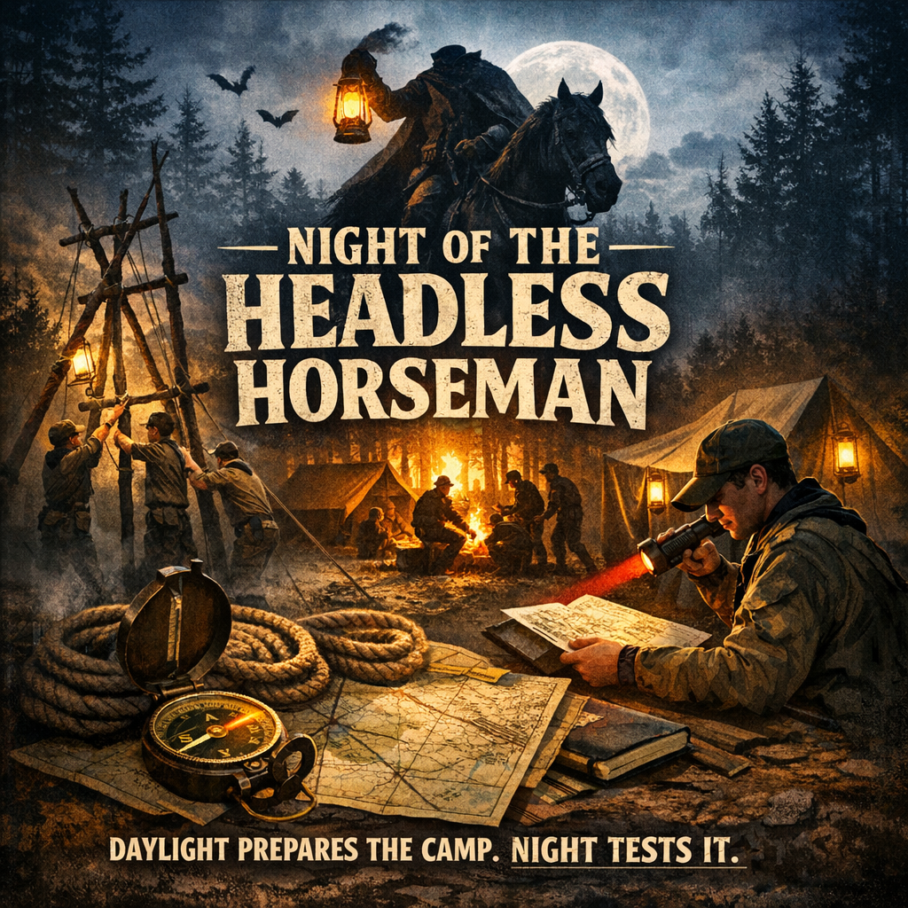 Patrols will train, build, navigate, and compete through structured daytime challenges designed to sharpen real Scout skills — leadership, first aid, pioneering, navigation, marksmanship, and teamwork under pressure.